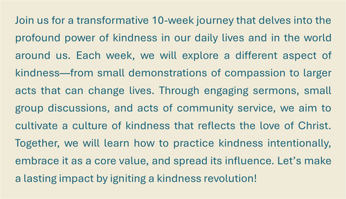 Kindness is more than a polite smile or a good deed—it is a powerful gift, given to us by God to transform lives, heal relationships, and reflect Christ’s love in a hurting world. In this 10-week series, we will explore what true kindness looks like: to ourselves, in our homes, in conflict, toward the least of these, and even when it comes at a cost. Join us each week, online or in person, Sunday mornings at 9:00 and 11:00,as we discover how practicing kindness can change us, our community, and the world around us.